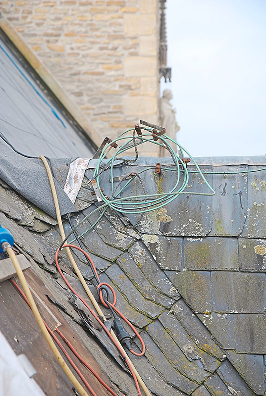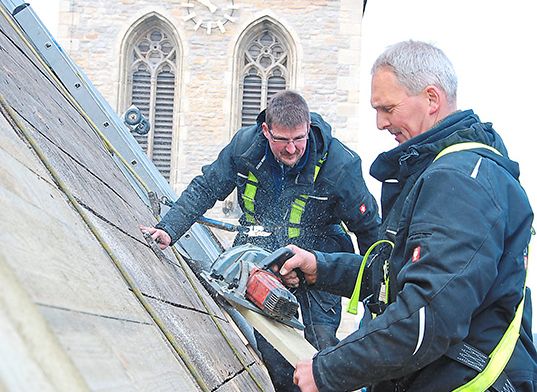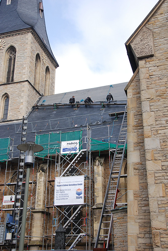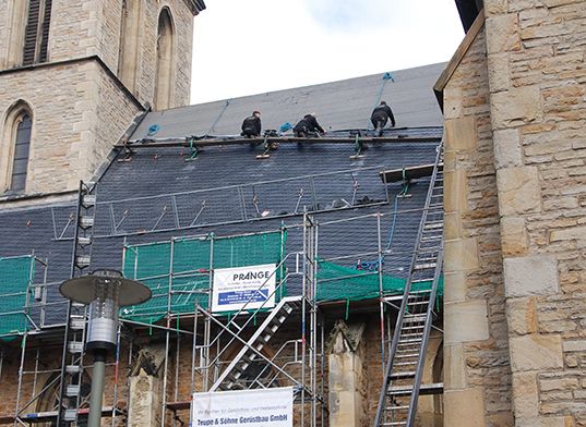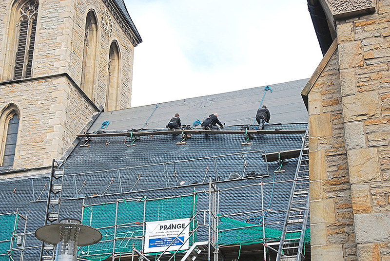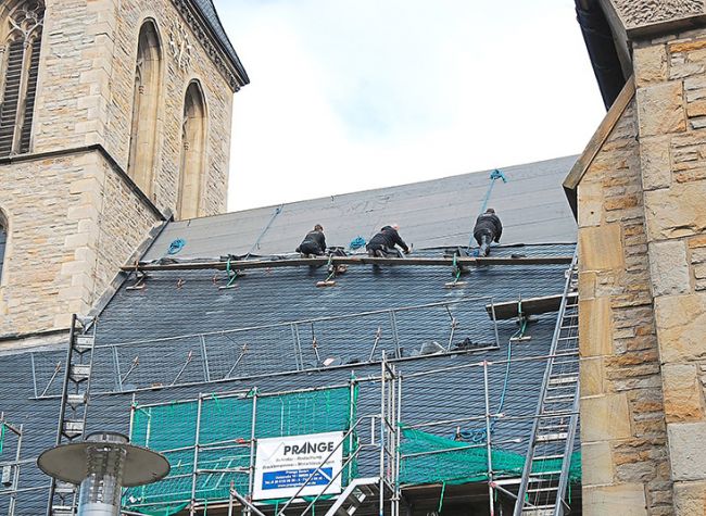 Die aktuellen Arbeiten sind der Schlusspunkt der Sanierung des Gotteshauses, die sich - zunächst innen, später außen - seit Jahren hinzieht. Nach Chor und Turmhelm bekommt jetzt auch das Hauptschiff eine neue Eindeckung aus hochwertigem Moselschiefer. Im Mai soll die Südseite fertig werden, die Nordseite im Laufe des Septembers. „So ein Dach kann 80 bis 100 Jahre halten", hofft Architekt Andreas Holtfrerich, dass die Gemeinde dann vorerst Ruhe hat.