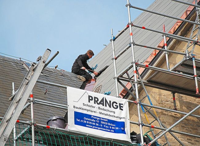 Wenn man sieht, mit welcher Routine sich die Handwerker auf dem Dach bewegen, wie jeder Schritt sitzt und die Männer auch auf engstem Raum aneinander vorbeikommen, dann könnte man glatt meinen, da wären echte Alpinisten oder Bergfexe am Werk. Einen Unterschied gibt es jedoch. Franz-Josef Huckenbeck kennt ihn: „Anders als der Bayer fängt der Westfale nicht an zu jodeln, sondern ruft nach Mama, wenn etwas schief geht."