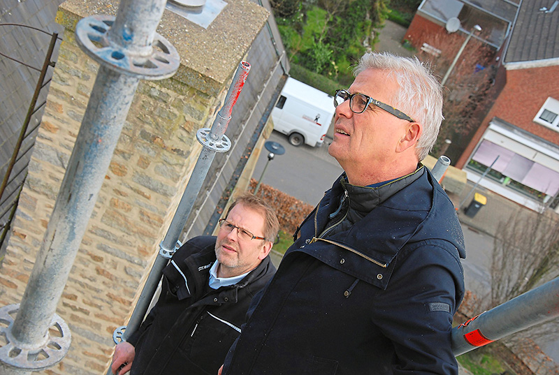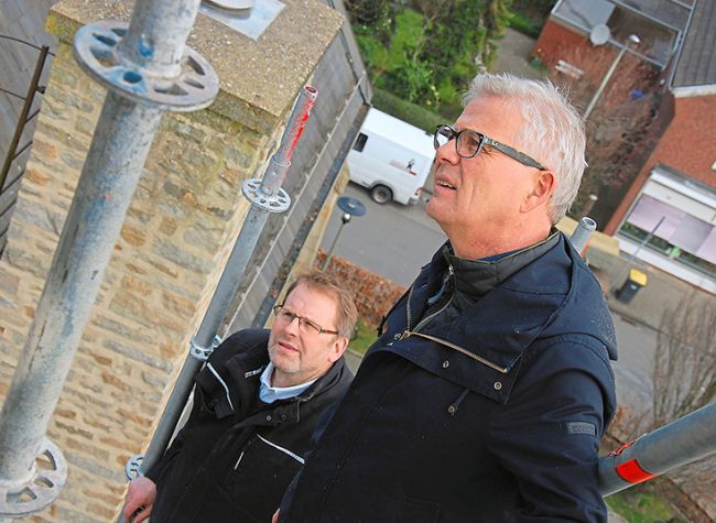 Ins Sicherungsseil gefallen oder gar vom Dach gestürzt ist Zimmermeister Hubert Brockötter nach eigener Aussage noch nie. Und dennoch achten er und sein Kollege Jörg Sechelmann penibel darauf, dass sie genau wie Bergsteiger immer korrekt angeseilt sind. Nicht nur, weil das Hauptschiff der St.-Dionysius-Kirche eine stattliche Höhe hat und weil die Berufsgenossenschaft es so will, "sondern weil man sich darauf verlassen kann", sagt Firmeninhaber Franz-Josef Huckenbeck. Und mit diesem Gefühl von Sicherheit lasse es sich einfach besser arbeiten. Zimmerleute, Dachdecker und Klempner sind so etwas wie die Akrobaten auf dem Bau. Seit sie wieder an der St.-Dionysius-Kirche arbeiten, um den letzten Abschnitt der Außensanierung über die Bühne zu bringen, ist das Klopfen und Hämmern im ganzen Dorf zu hören. Kein Wunder bei dem Resonanzkörper, auf dem die Handwerker da mitten im Ort herumturnen und arbeiten. Immer wieder leiben unten Passanten stehen und schauen den Männer zu, die in luftiger Höhe ihr Tagewerk verrichten. Allerdings gibt es auch Zwangspausen - immer wenn gerade eine Messe gefeiert wird.