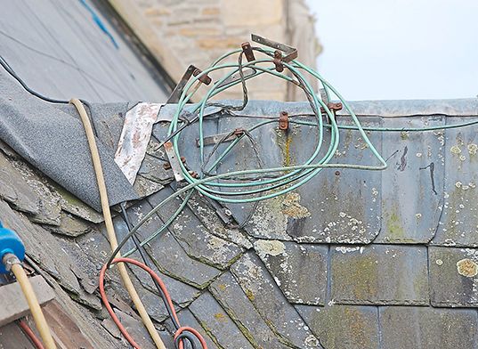 Damit das auch so kommt, überlassen die Handwerker nichts dem Zufall. Morsche oder vom Holzbock zerfressene Balken wurden bereits ausgetauscht, die alte Eichenschalung wird mit einer neuen Schicht aus Weichholz „überbeerdigt", obendrauf kommt noch eine Lage Teerpappe - und erst dann der Schiefer. Zwar werden die grauen Steinplatten so verlegt, dass die Pappe eigentlich gar nicht nötig wäre, doch ein Problem gibt es: „Zwischen dem Aufbringen der neuen Schalung und des neuen Schiefers können mehrere Tage vergehen. Bei Regen würden die Bretter in dieser Zeit richtig nass werden", erläutert Huckenbeck.